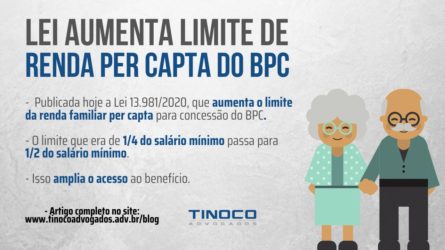 Foi publicada hoje (24/03/2020) a Lei 13.981/2020 que aumenta o limite da renda familiar per captapara concessão do BPC. BPC…